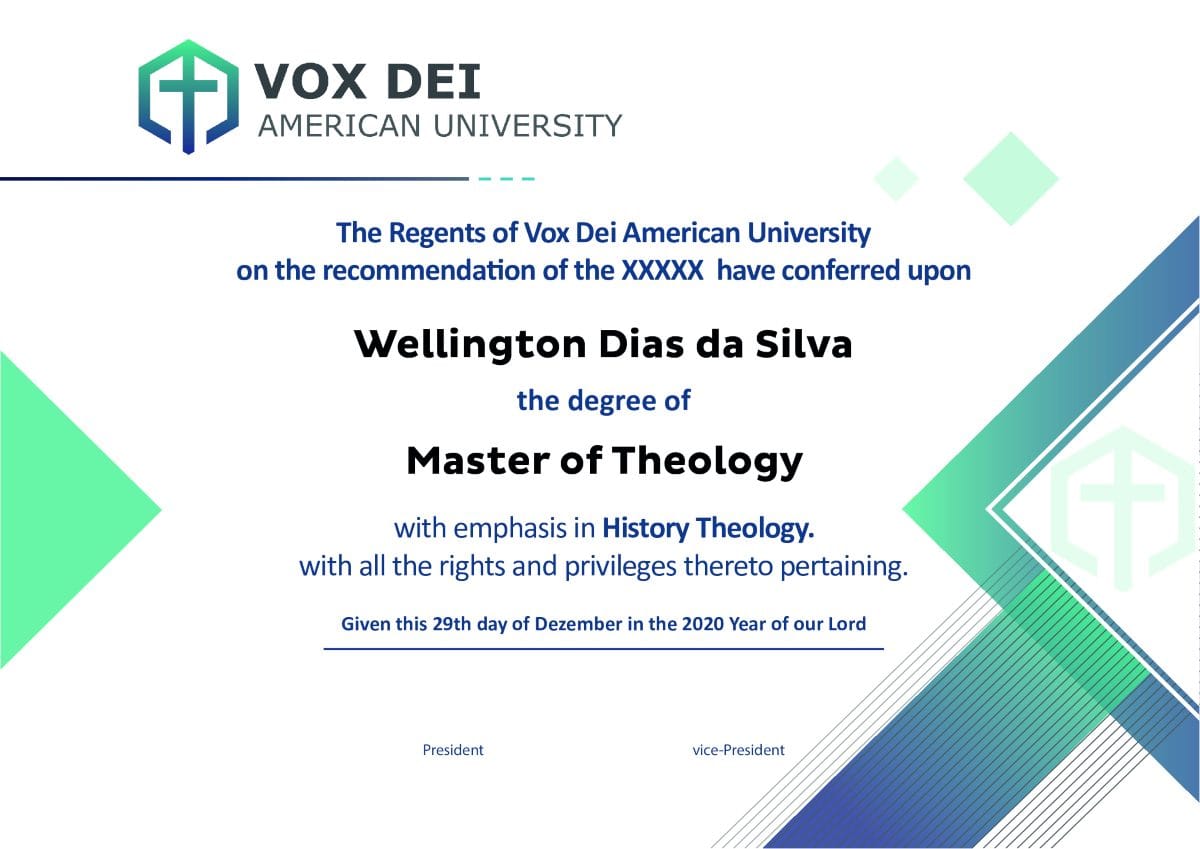 Ao concluir todas as exigências curriculares e regulatórias, o aluno receberá o Diploma de Bacharel em Teologia emitido pela Vox Dei American University e, posteriormente, o Diploma de Bacharel em Teologia expedido por uma instituição credenciada pelo MEC. Essa dupla certificação amplia significativamente as oportunidades profissionais e fortalece a credibilidade acadêmica.